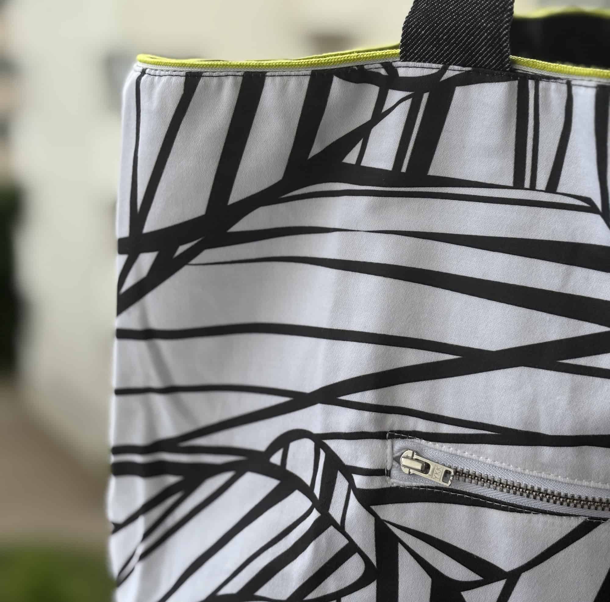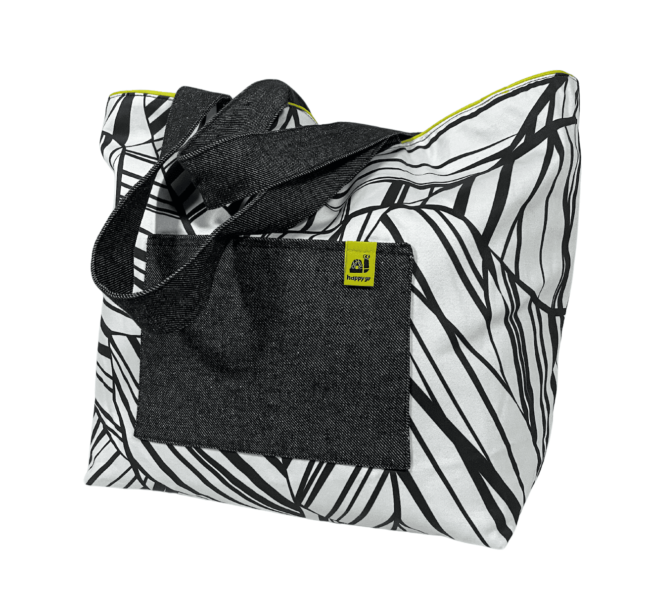 Grand cabas réversible en denim noir et imprimé Zebra noir et blanc. Léger, robuste et fonctionnel, il est idéal pour toutes les occasions du quotidien.